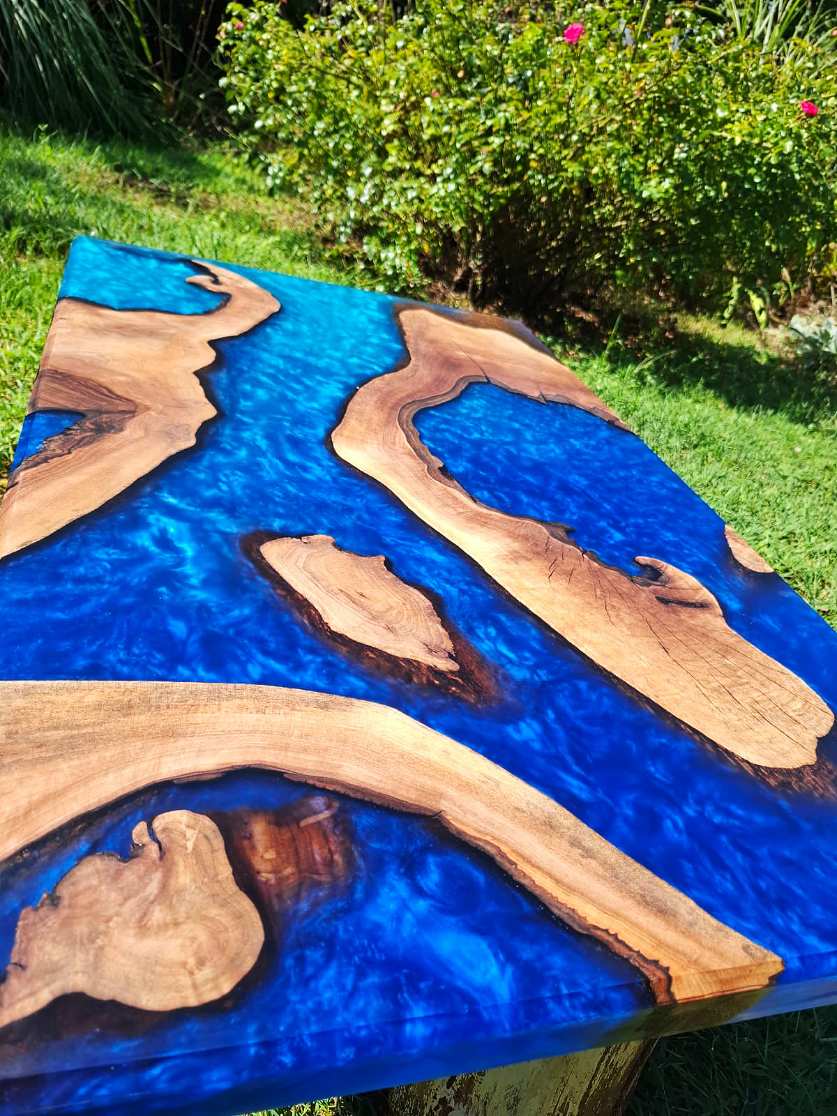 Epoxy stol od drveta močvarnog oraha sa dvije nijanje plave epoxy smole u prijelazu.
